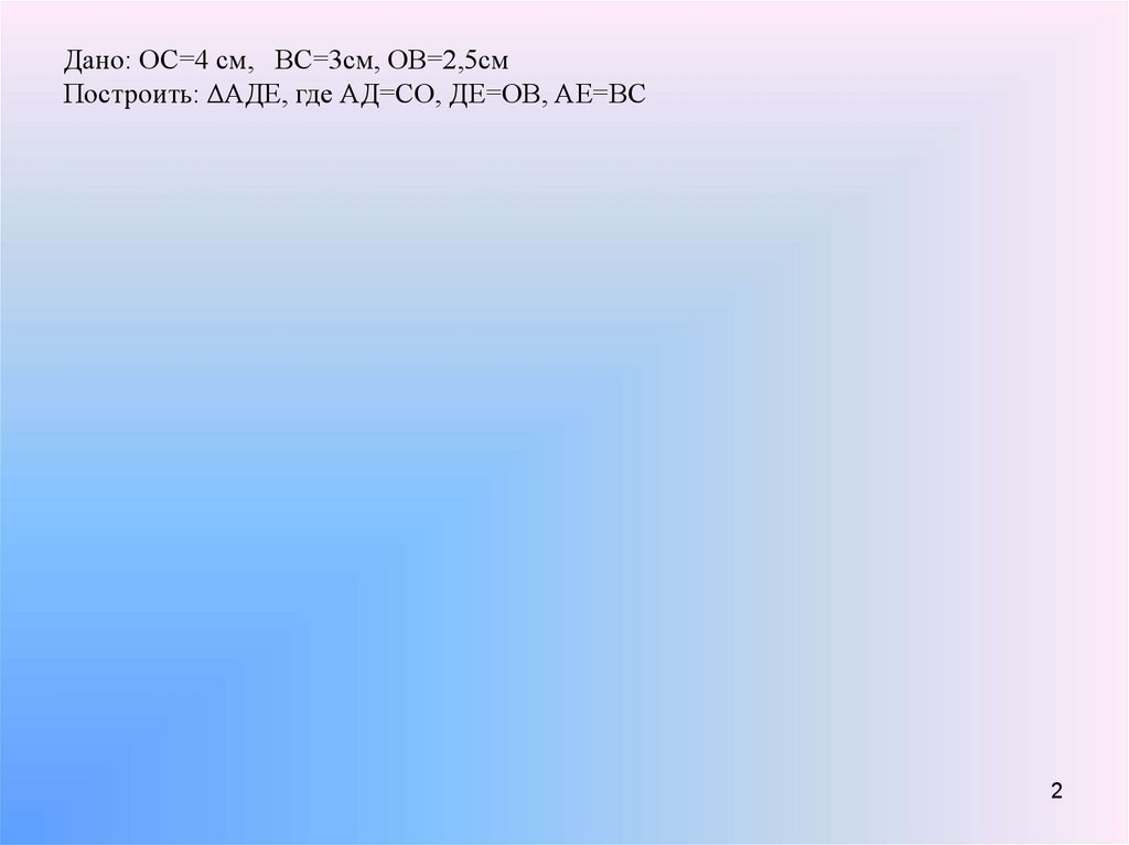 Дано: ОС=4 см, ВС=3см, ОВ=2,5смПостроить: ΔАДЕ, где АД=СО, ДЕ=ОВ, АЕ=ВС