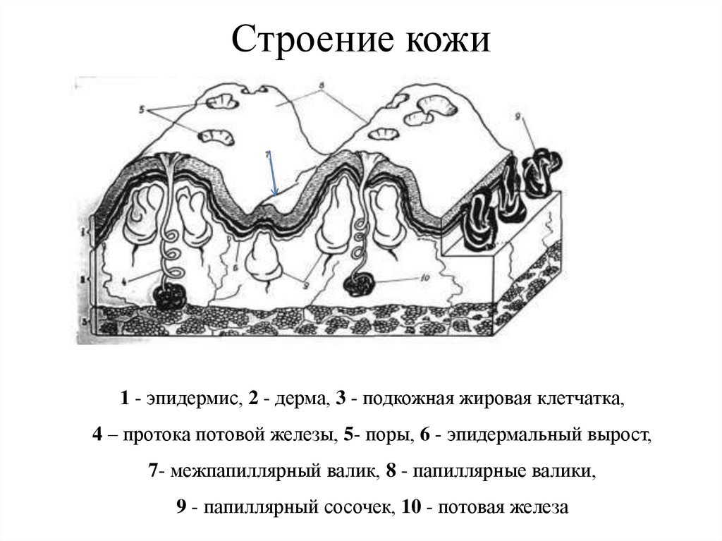 Строение кожи1 - эпидермис, 2 - дерма, 3 - подкожная жировая клетчатка,