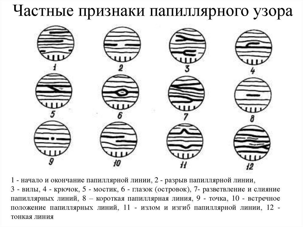 положение папиллярных линий, 11 - излом и изгиб папиллярной линии, 12 тонкая линия