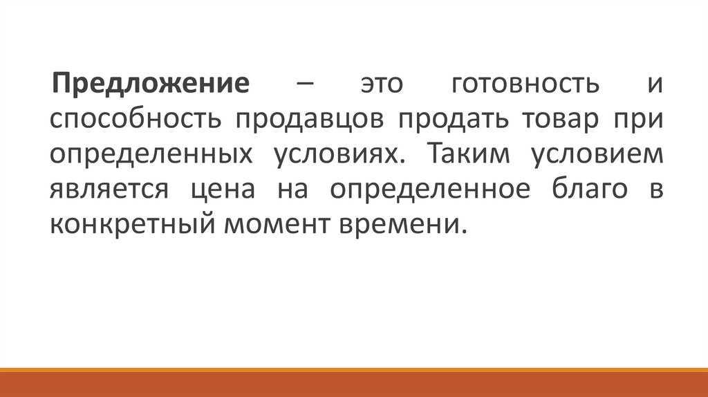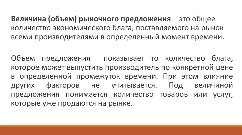 Величина (объем) рыночного предложения – это общееколичество экономического блага, поставляемого на рынок