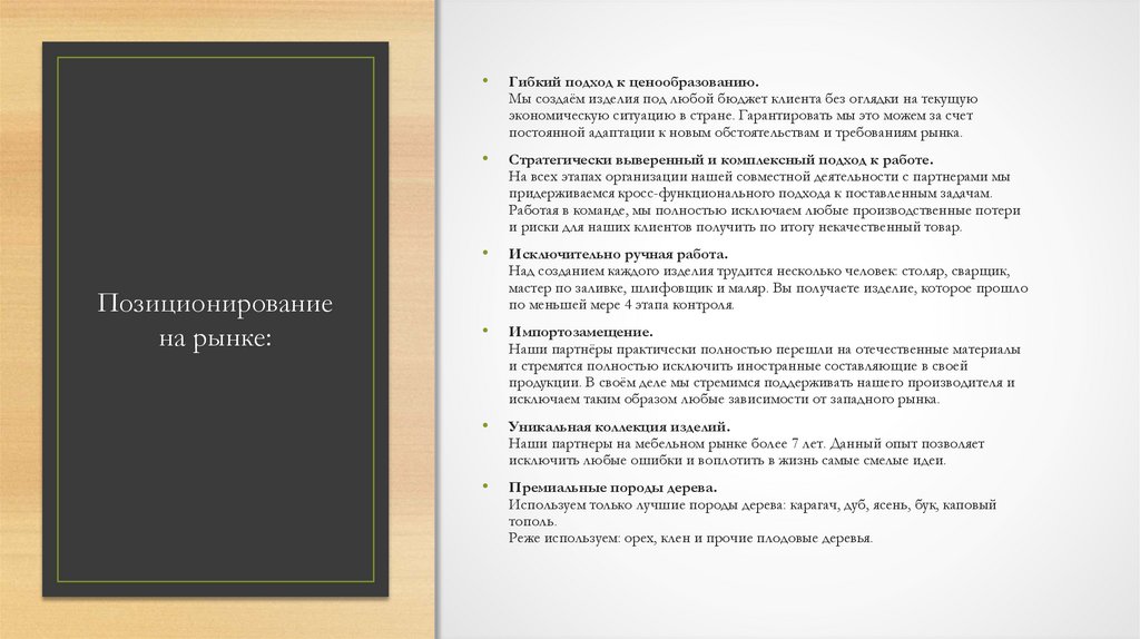 • Понятное и выверенное позиционирование на рынке.