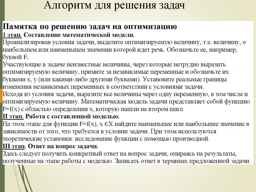 Алгоритм для решения задачПамятка по решению задач на оптимизацию