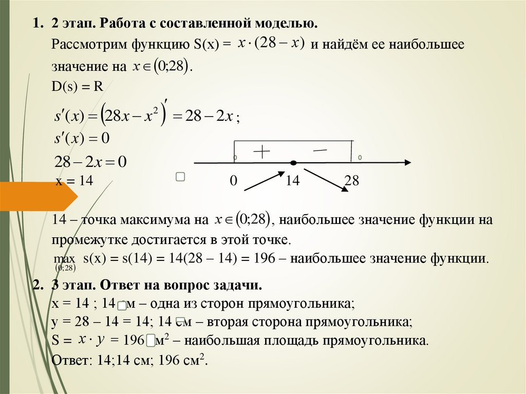 max s(x) = s(14) = 14(28 – 14) = 196 – наибольшее значение функции.