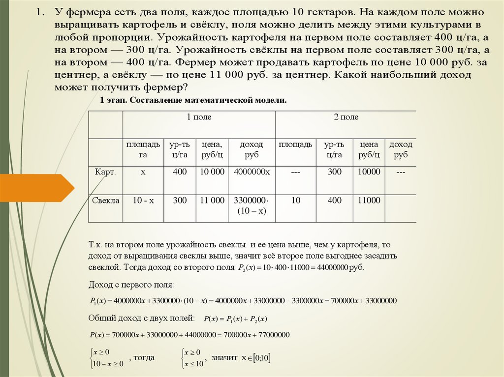 1. У фермера есть два поля, каждое площадью 10 гектаров. На каждом поле можновыращивать картофель и свёклу, поля можно делить между этими культурами в