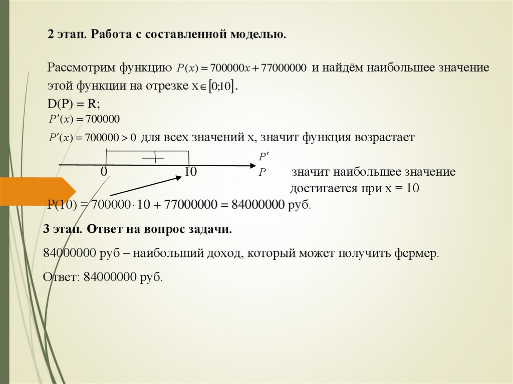 2 этап. Работа с составленной моделью.Рассмотрим функцию Р( х) 700000 х 77000000 и найдём наибольшее значение