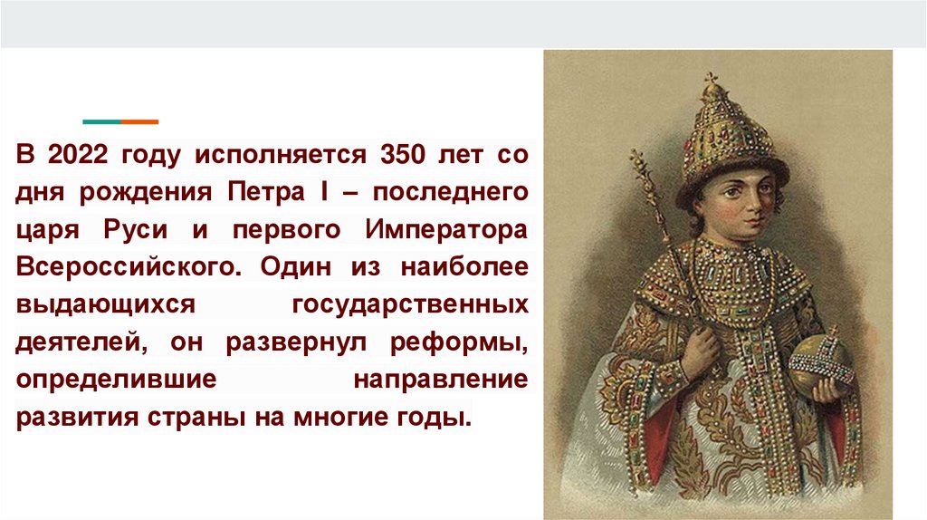 В 2022 году исполняется 350 лет содня рождения Петра I – последнего