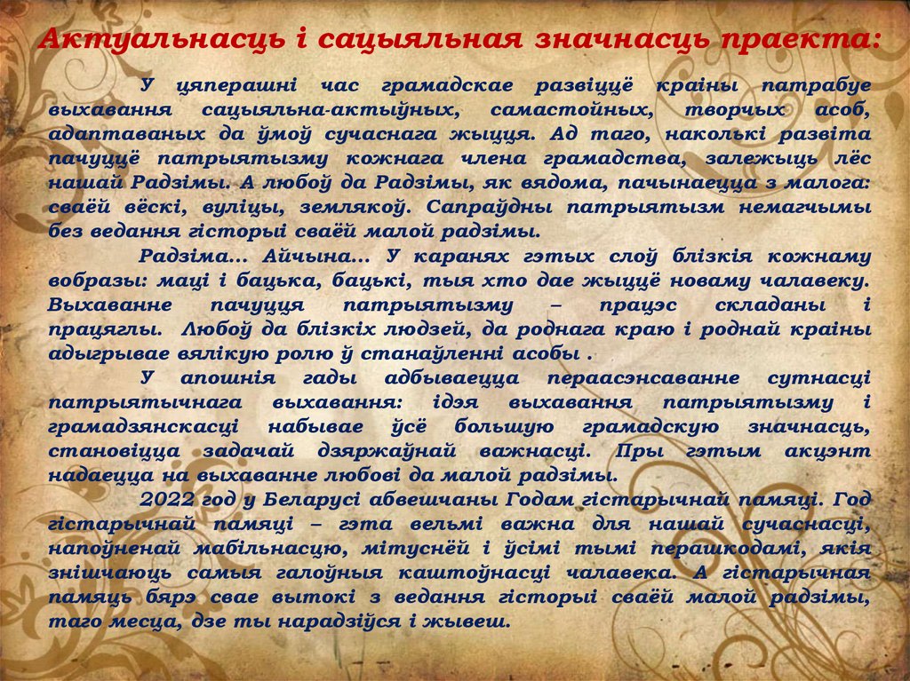 Актуальнасць і сацыяльная значнасць праекта:У цяперашні час грамадскае развіццё краіны патрабуе