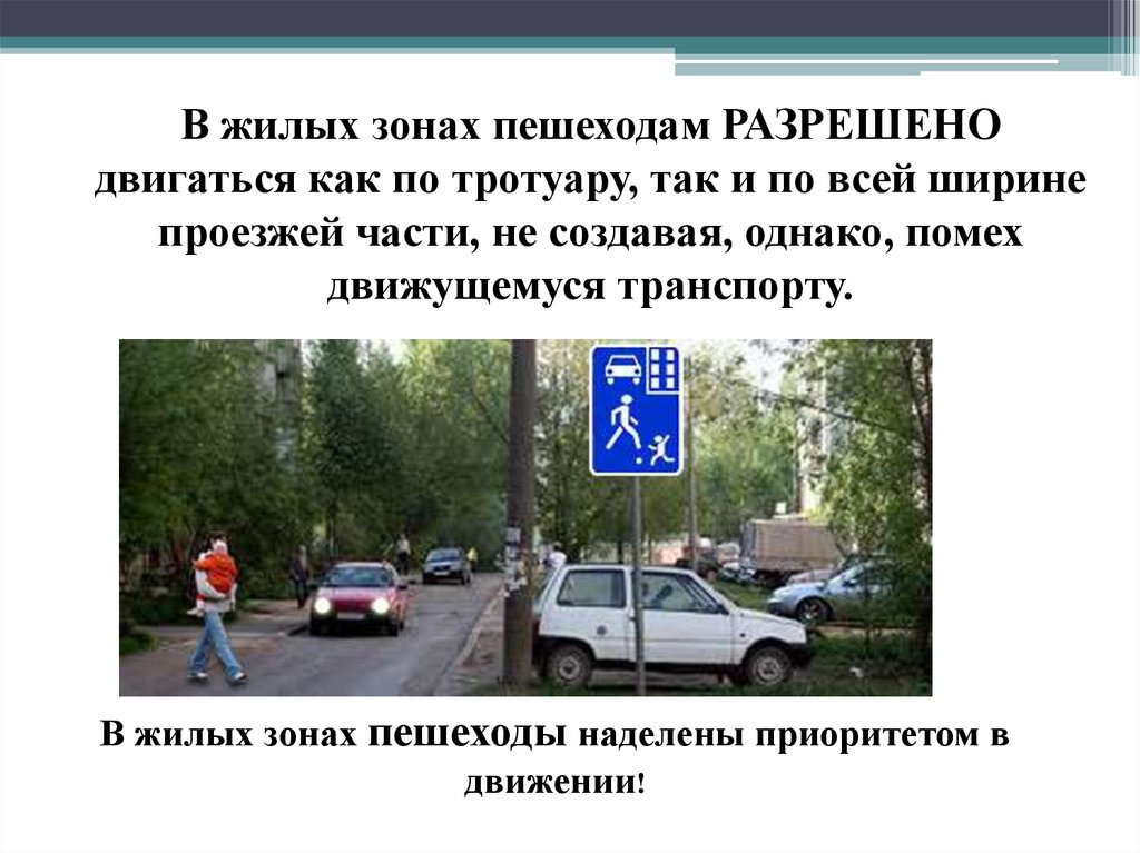 В жилых зонах пешеходам РАЗРЕШЕНОдвигаться как по тротуару, так и по всей ширине