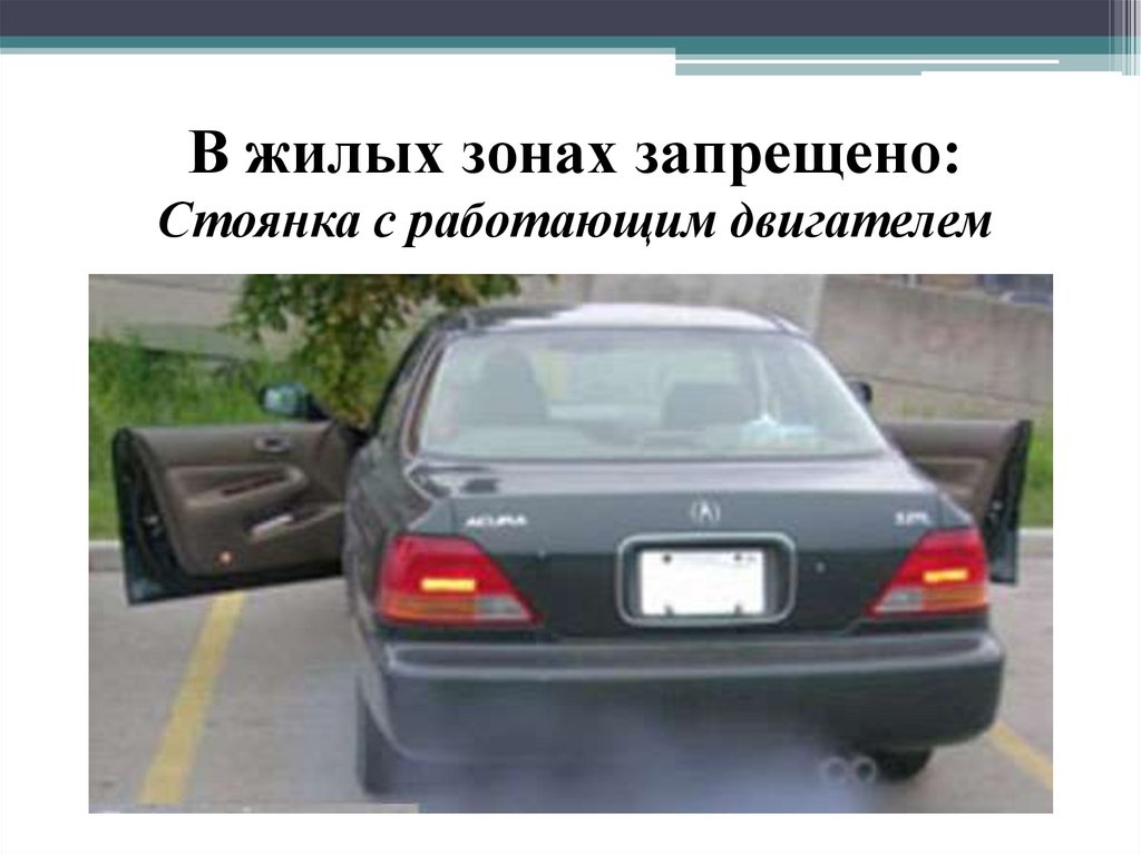 В жилых зонах запрещено:Стоянка с работающим двигателем