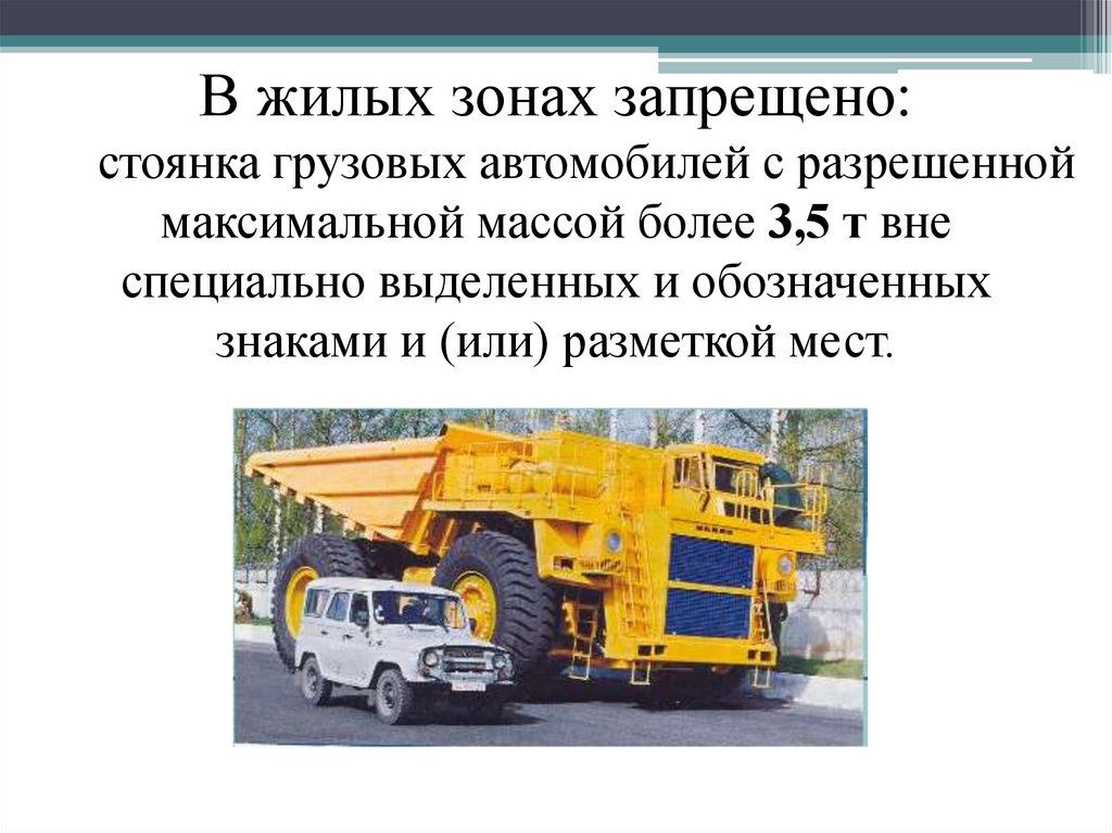 В жилых зонах запрещено:стоянка грузовых автомобилей с разрешенной