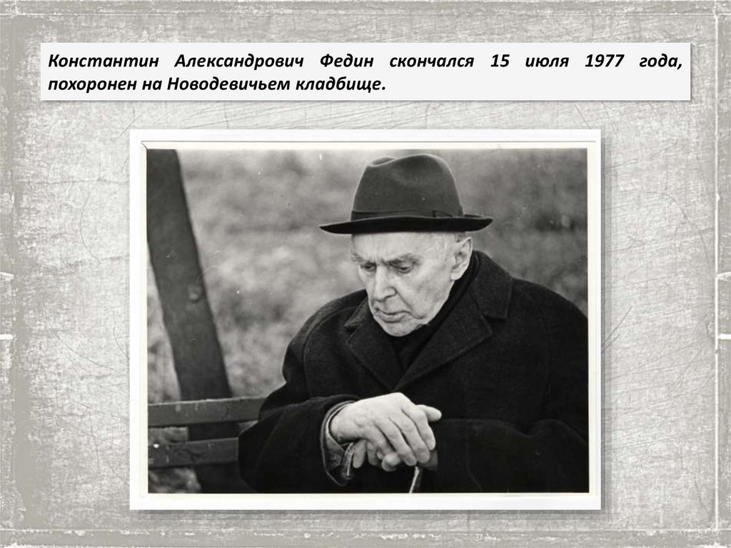 Константин Александрович Федин скончался 15 июля 1977 года,похоронен на Новодевичьем кладбище.