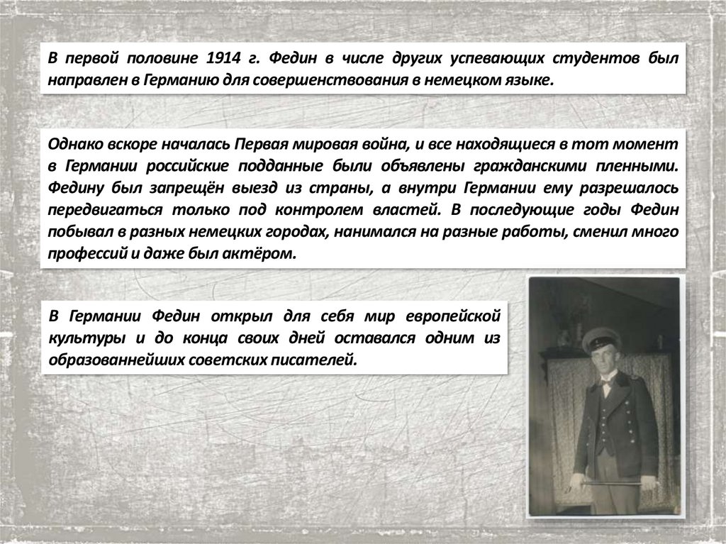 В первой половине 1914 г. Федин в числе других успевающих студентов былнаправлен в Германию для совершенствования в немецком языке.