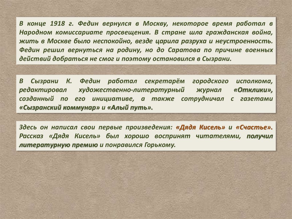 В конце 1918 г. Федин вернулся в Москву, некоторое время работал вНародном комиссариате просвещения. В стране шла гражданская война,