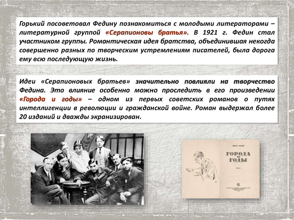 Горький посоветовал Федину познакомиться с молодыми литераторами –литературной группой «Серапионовы братья». В 1921 г. Федин стал