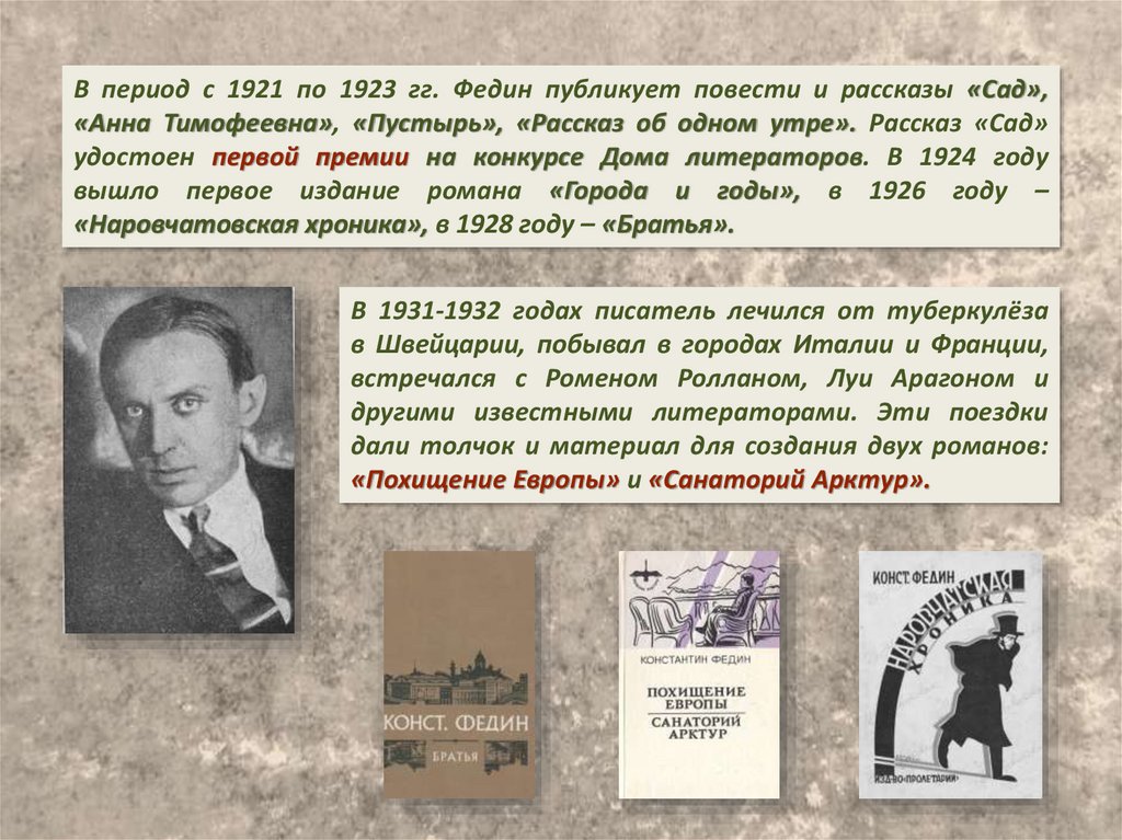 В период с 1921 по 1923 гг. Федин публикует повести и рассказы «Сад»,«Анна Тимофеевна», «Пустырь», «Рассказ об одном утре». Рассказ «Сад»