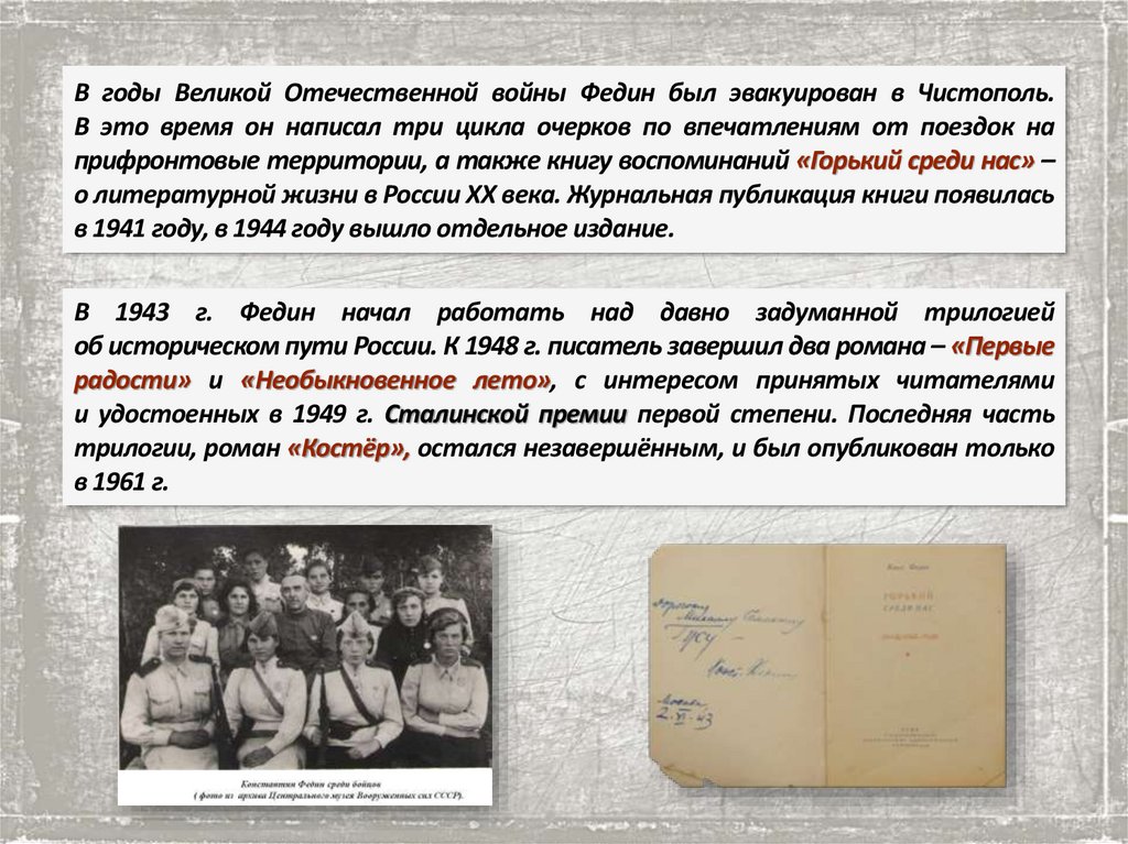 В годы Великой Отечественной войны Федин был эвакуирован в Чистополь.В это время он написал три цикла очерков по впечатлениям от поездок на