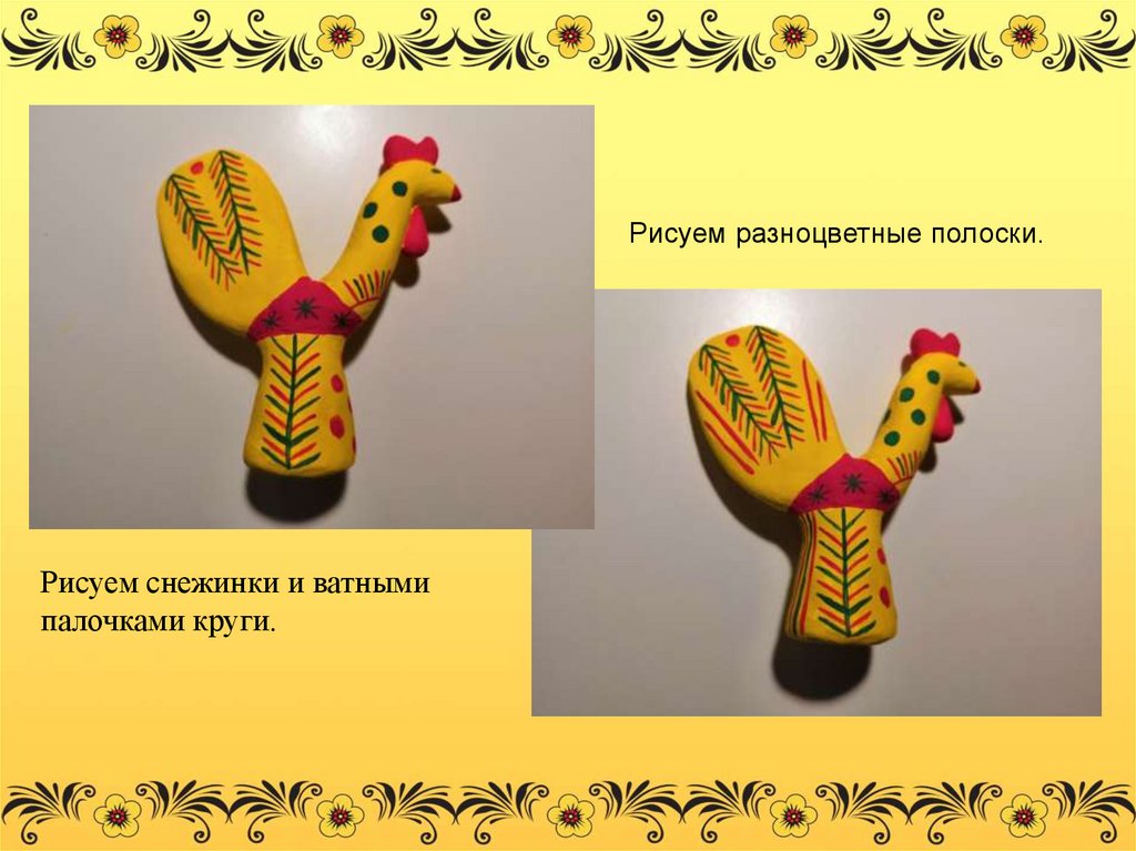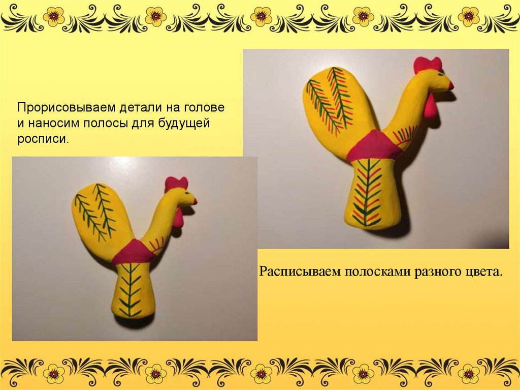 В отличие от дымковских, все филимоновские игрушки свистульки, даже барыни и кавалеры. Свисток всегда находитсяв хвосте зверей и птиц, которых они держат.