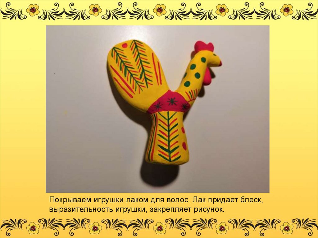 Покрываем игрушки лаком для волос. Лак придает блеск,выразительность игрушки, закрепляет рисунок.