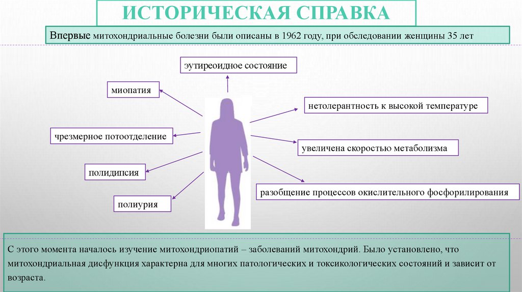 ИСТОРИЧЕСКАЯ СПРАВКАВпервые митохондриальные болезни были описаны в 1962 году, при обследовании женщины 35 лет