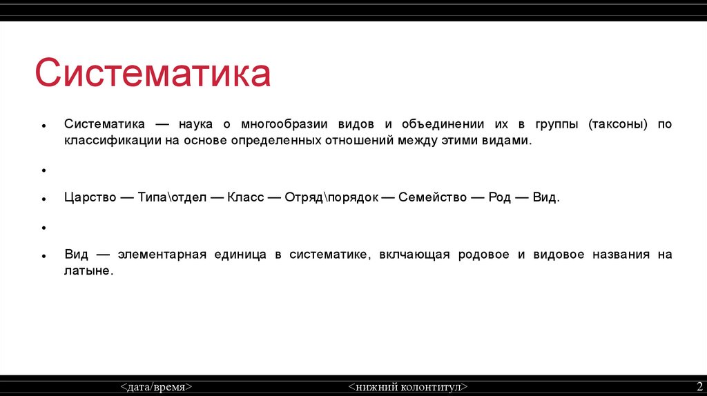 Царство — Типа\отдел — Класс — Отряд\порядок — Семейство — Род — Вид.