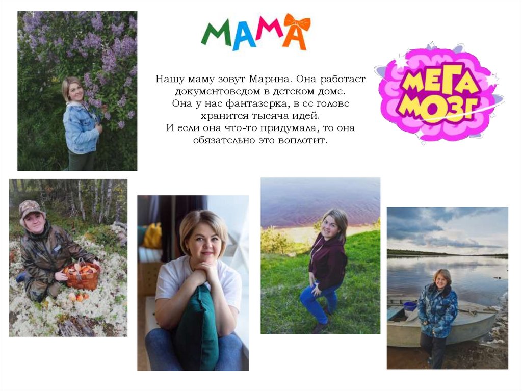 Нашу маму зовут Марина. Она работаетдокументоведом в детском доме.