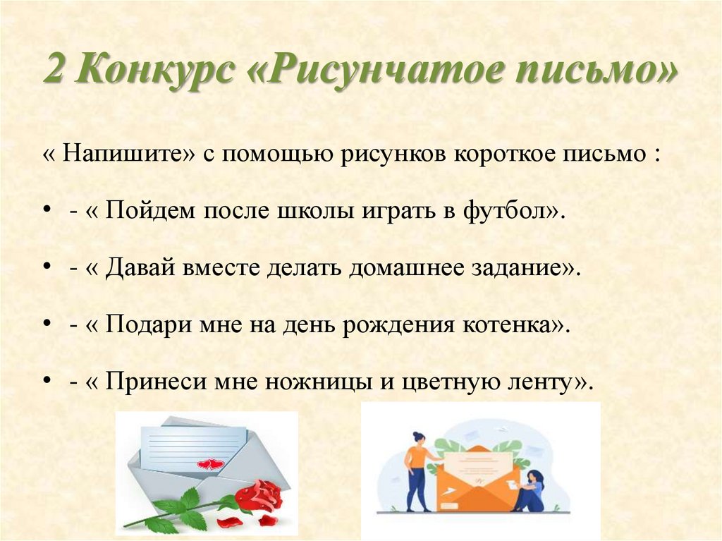 2 Конкурс «Рисунчатое письмо»« Напишите» с помощью рисунков короткое письмо :