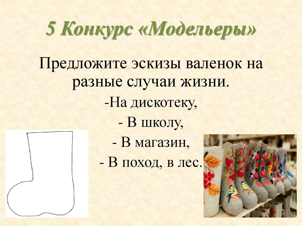 5 Конкурс «Модельеры»Предложите эскизы валенок на