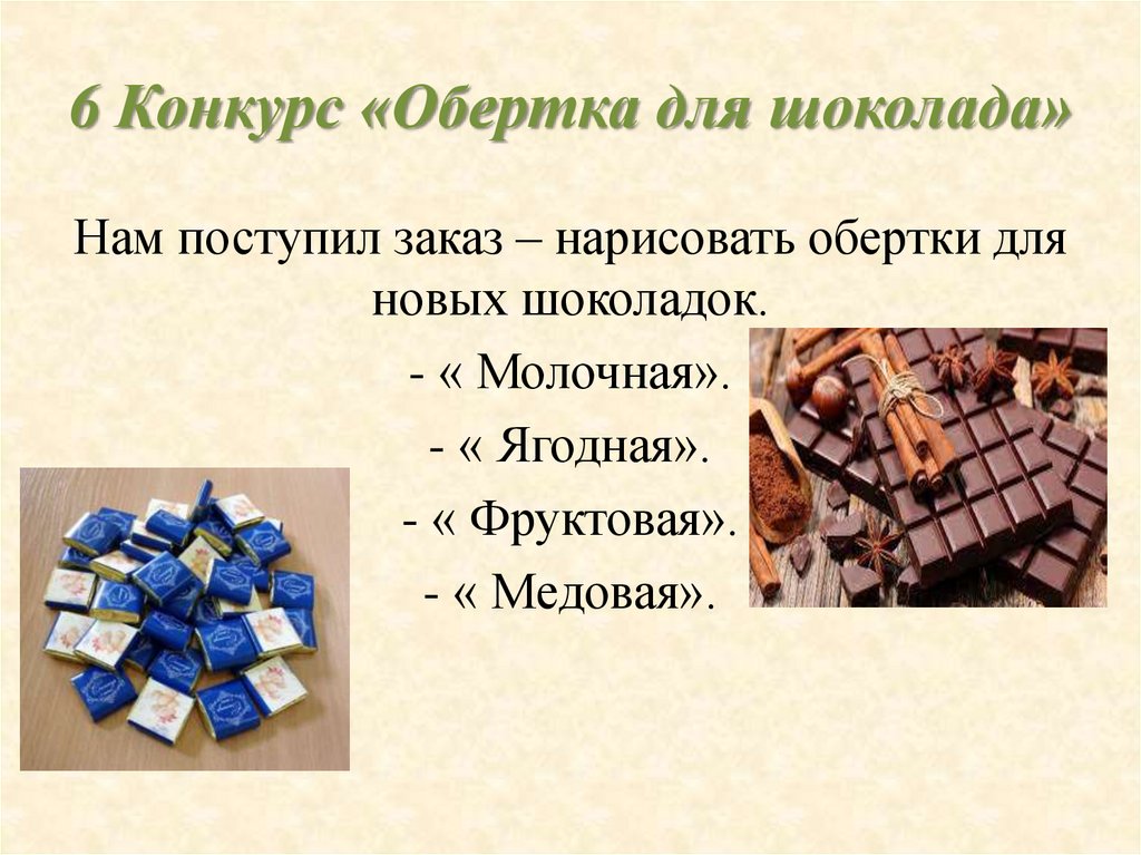6 Конкурс «Обертка для шоколада»Нам поступил заказ – нарисовать обертки для