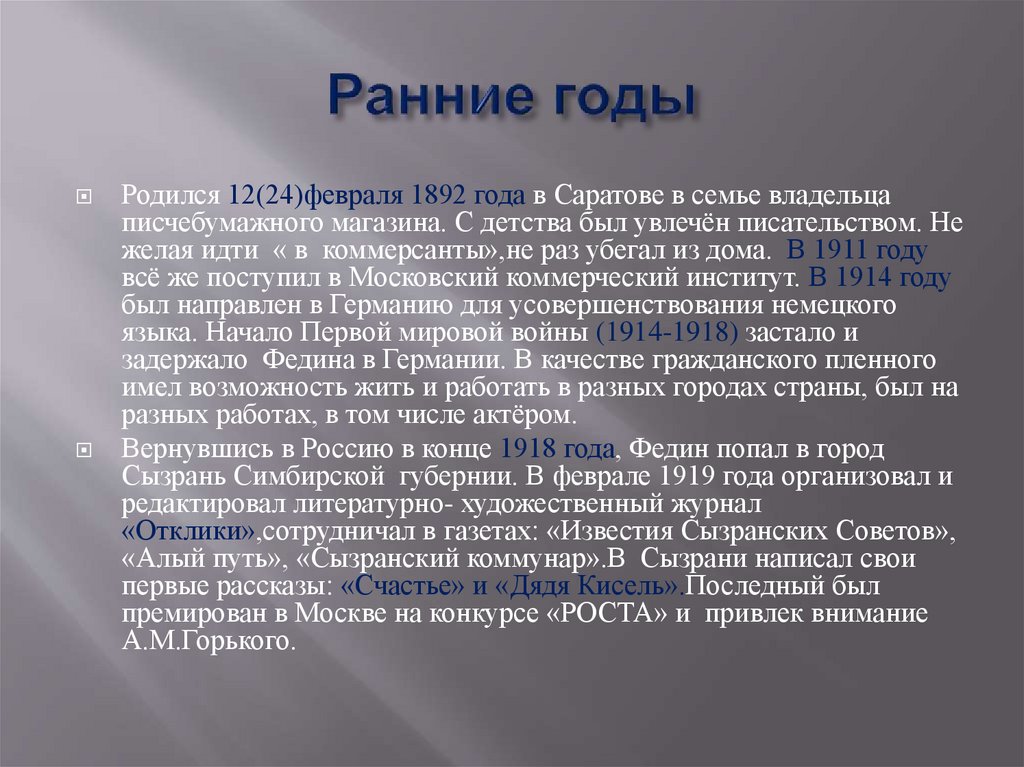 Вернувшись в Россию в конце 1918 года, Федин попал в город