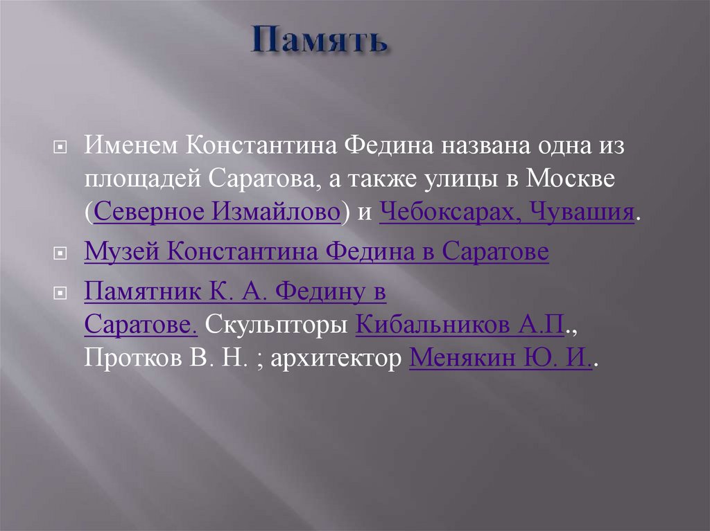 Именем Константина Федина названа одна изплощадей Саратова, а также улицы в Москве