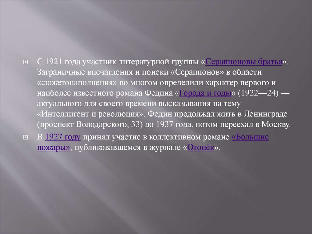 С 1921 года участник литературной группы «Серапионовы братья».Заграничные впечатления и поиски «Серапионов» в области