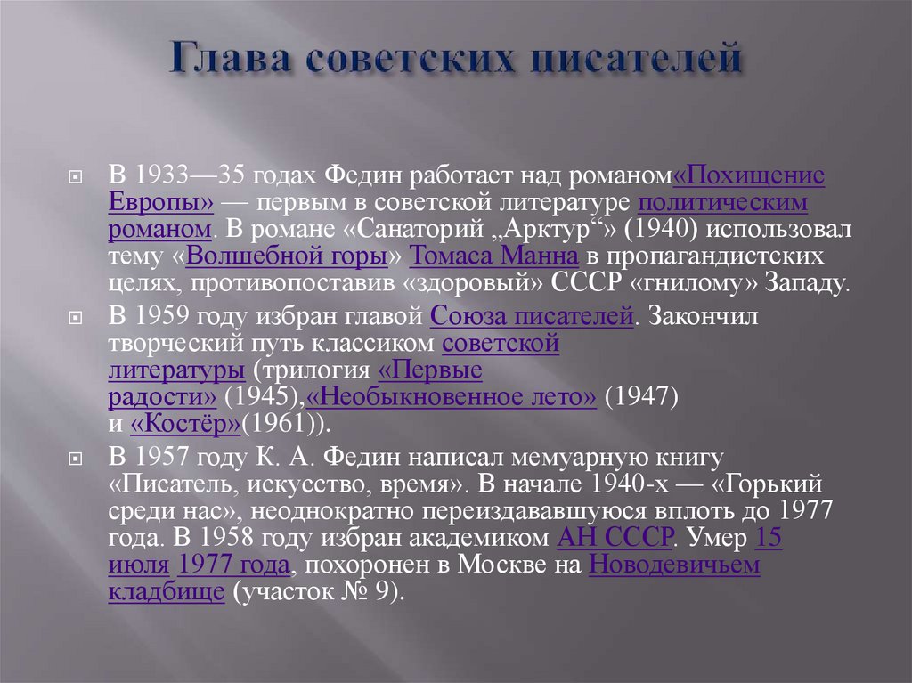 В 1933—35 годах Федин работает над романом«ПохищениеЕвропы» — первым в советской литературе политическим
