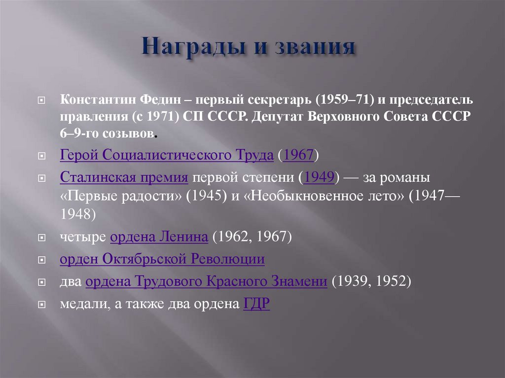 Константин Федин – первый секретарь (1959–71) и председательправления (с 1971) СП СССР. Депутат Верховного Совета СССР