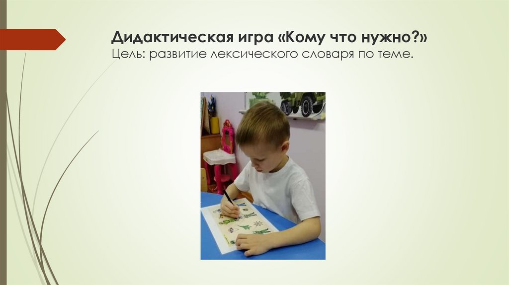 Дидактическая игра «Кому что нужно?»Цель: развитие лексического словаря по теме.