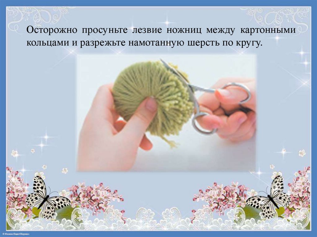 Осторожно просуньте лезвие ножниц между картоннымикольцами и разрежьте намотанную шерсть по кругу.