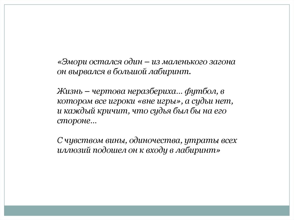«Эмори остался один – из маленького загонаон вырвался в большой лабиринт.