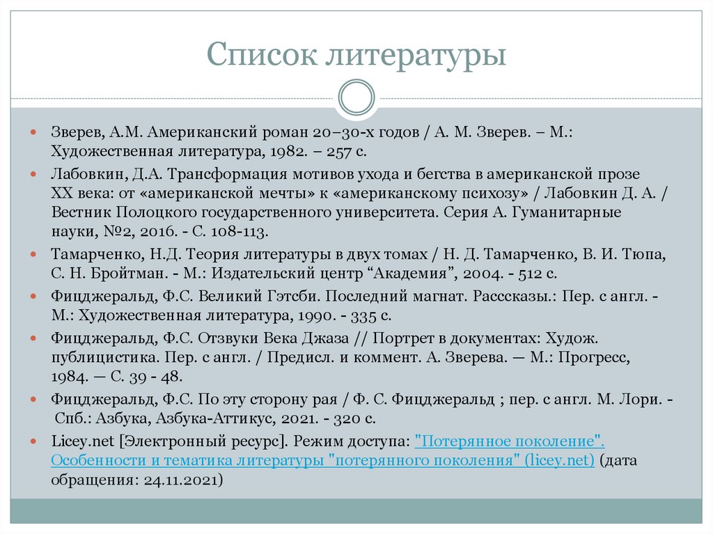 Список литературыЗверев, А.М. Американский роман 20–30-х годов / А. М. Зверев. – М.: