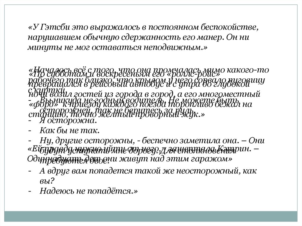 «У Гэтсби это выражалось в постоянном беспокойстве,нарушавшем обычную сдержанность его манер. Он ни
