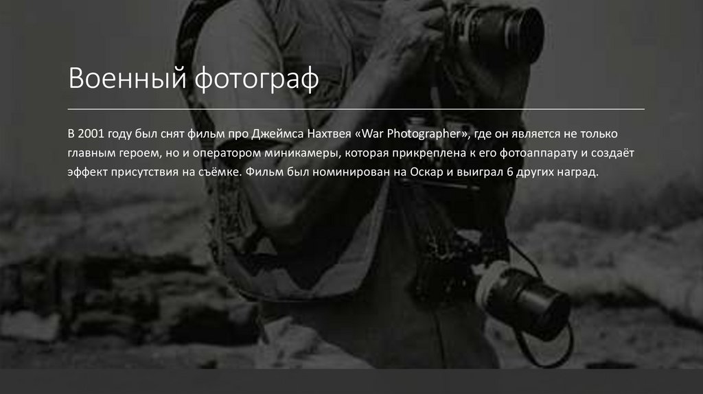 Военный фотографВ 2001 году был снят фильм про Джеймса Нахтвея «War Photographer», где он является не только