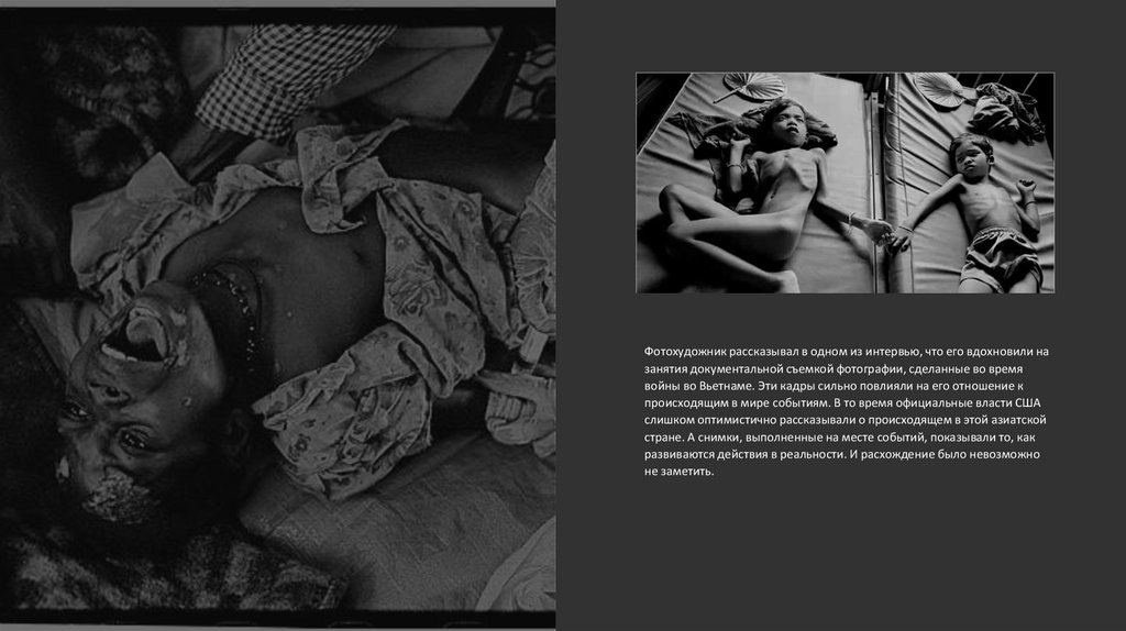 Фотохудожник рассказывал в одном из интервью, что его вдохновили назанятия документальной съемкой фотографии, сделанные во время