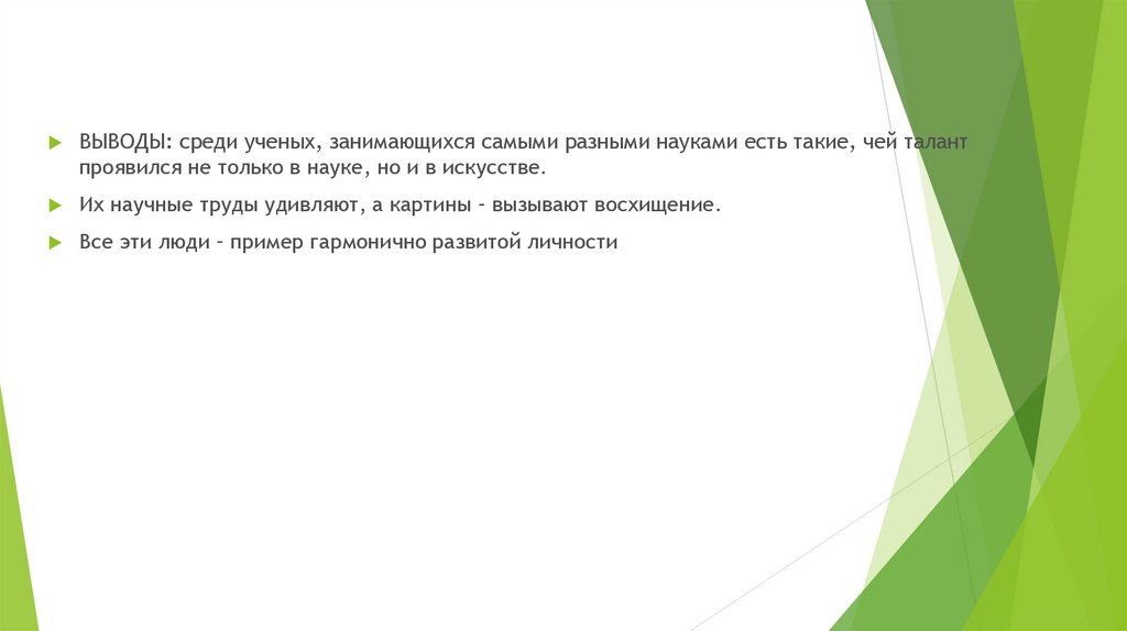 ВЫВОДЫ: среди ученых, занимающихся самыми разными науками есть такие, чей талантпроявился не только в науке, но и в искусстве.