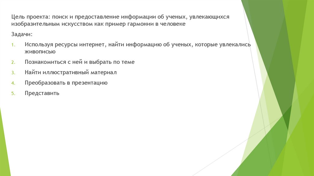 Цель проекта: поиск и предоставление информации об ученых, увлекающихсяизобразительным искусством как пример гармонии в человеке