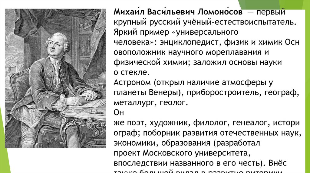Михаи́л Васи́льевич Ломоно́сов — первыйкрупный русский учёный-естествоиспытатель.