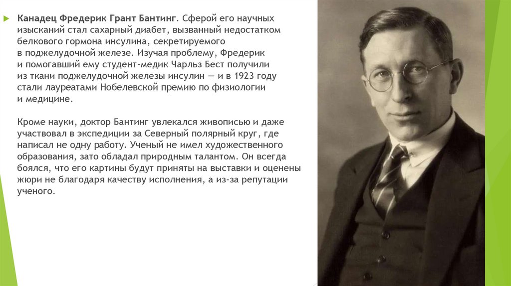 Канадец Фредерик Грант Бантинг. Сферой его научныхизысканий стал сахарный диабет, вызванный недостатком