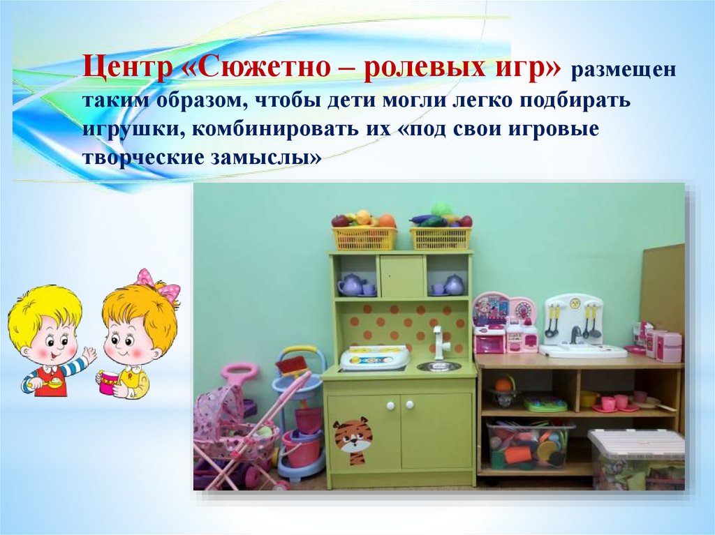 Центр «Сюжетно – ролевых игр» размещентаким образом, чтобы дети могли легко подбирать