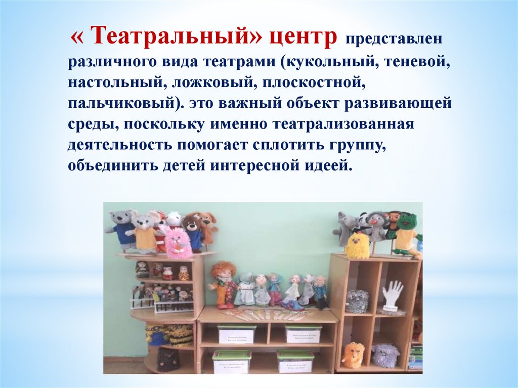 « Театральный» центр представленразличного вида театрами (кукольный, теневой,