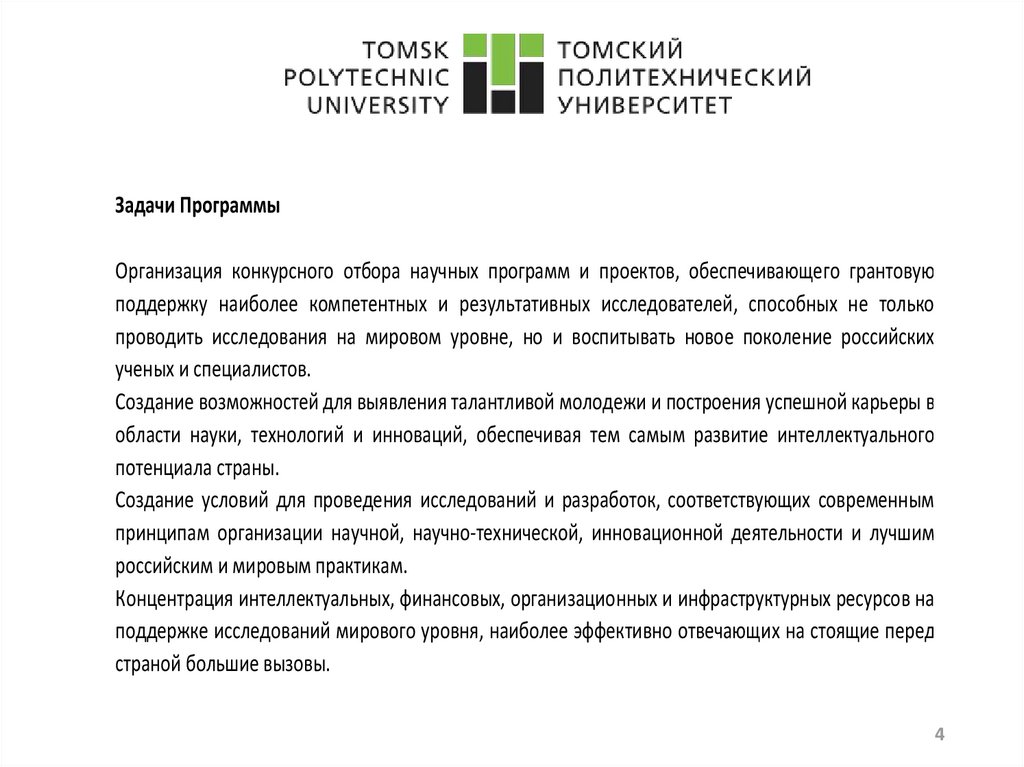 Задачи ПрограммыОрганизация конкурсного отбора научных программ и проектов, обеспечивающего грантовую
