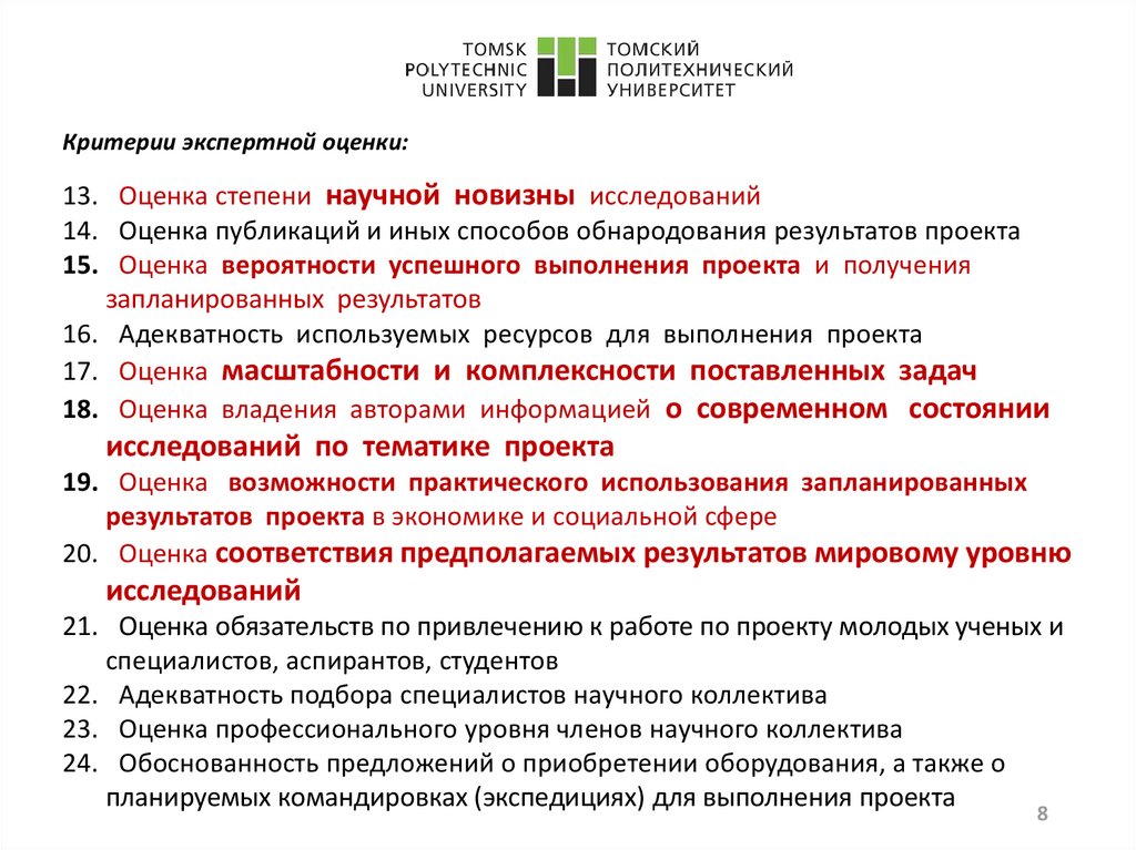 Критерии экспертной оценки:13. Оценка степени научной новизны исследований