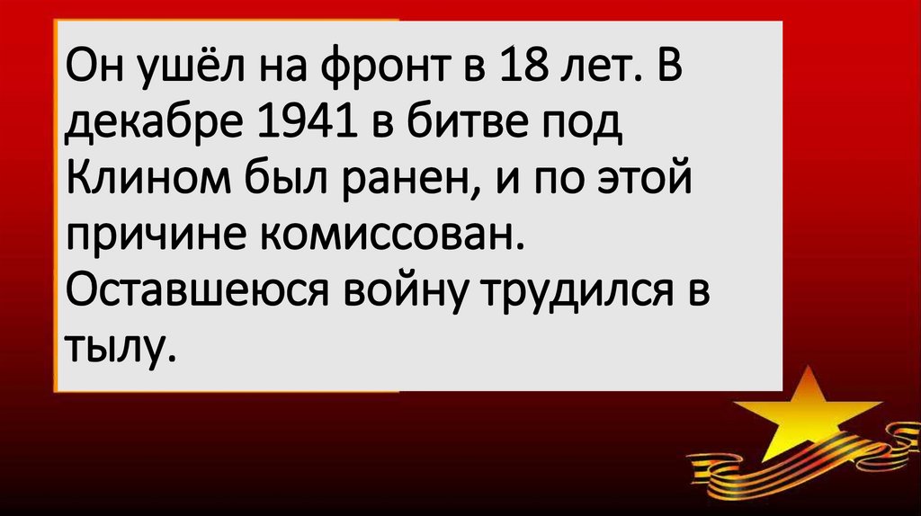 Он ушёл на фронт в 18 лет. Вдекабре 1941 в битве под