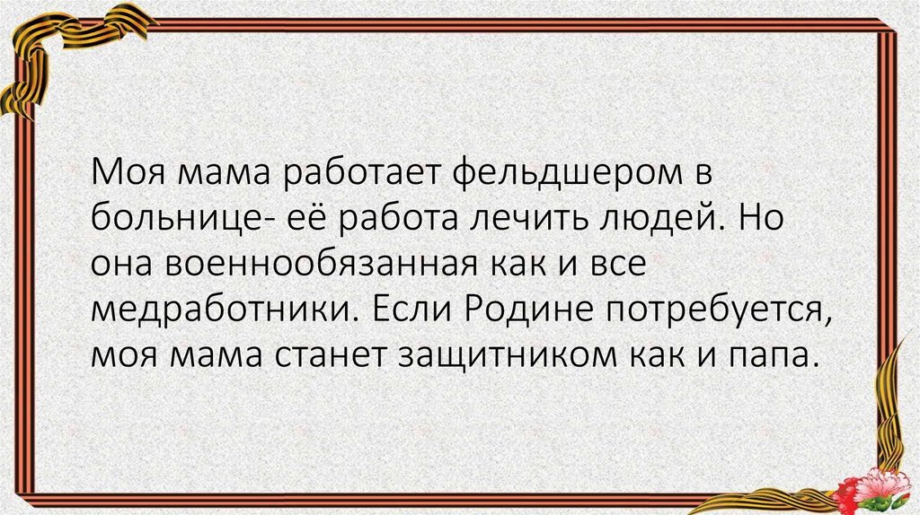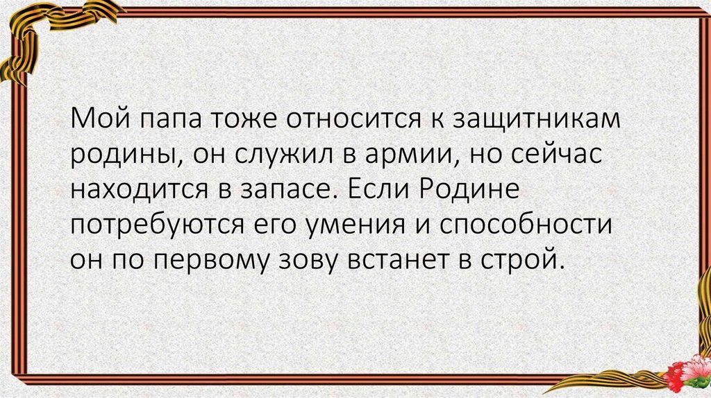 Мой папа тоже относится к защитникамродины, он служил в армии, но сейчас